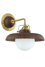Stratford Sconce - A striking fusion of materials gives this fixture a distinctive style that effortlessly balances mid-century modern and farmhouse aesthetics. The warm brass metal finish is complemented by a wood-look shade and backplate, creating a rich contrast of textures. A sleek white globe encases the bulb, diffusing light beautifully for a soft, ambient glow. This thoughtfully designed piece adds character and warmth to any space. Metal Finish with Glass Globe.